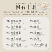 手羽元(国産)、米(愛知県産)、牛骨出汁(国産)、なつめ、雑穀(国産)、ガラスープ、生姜、海鮮ソース、塩麹、食塩、貝柱だし、クコの実、黒米、玄米(竜の瞳)、高麗人参