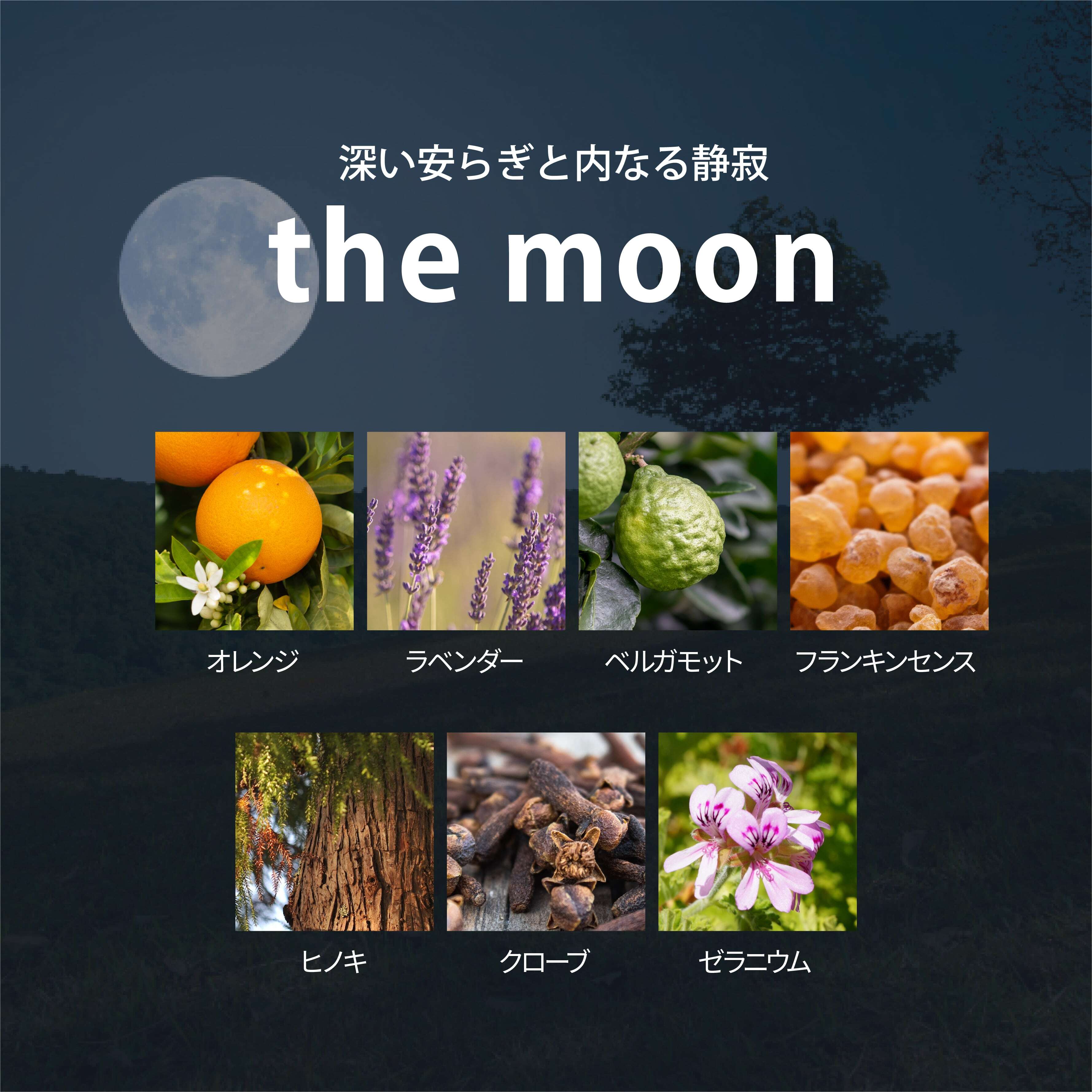 • 月のアロマ:オレンジ/ベルガモット/ラベンダー/フランキンセンス/ヒノキ/クローブ/ゼラニウム